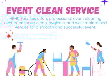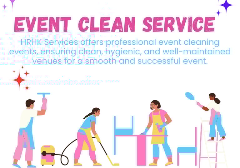 HRHK Services provides professional event cleaning for weddings, parties, corporate functions, exhibitions, concerts, and all types of events, ensuring clean venues after the event for a smooth and hassle-free experience.